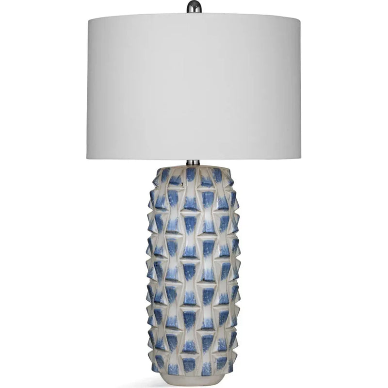 The Stones Table Lamp is crafted of ceramic with a white drum shade. Finish: blue, white. Material: ceramic. Wattage: 100W Max. Bulb Type: A. Socket Type: E26. The hand crafted details produced by a skilled artist lends itself to a unique technique and will vary slightly. Transform your space into a bold, dynamic work of art with the Stones Ceramic Blue Table Lamp.