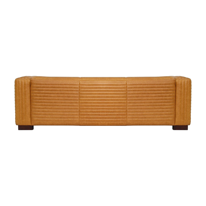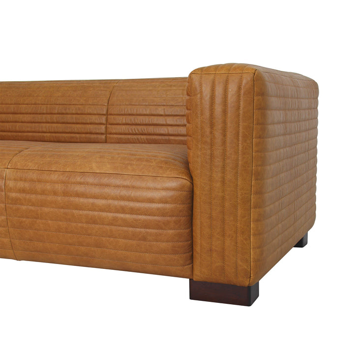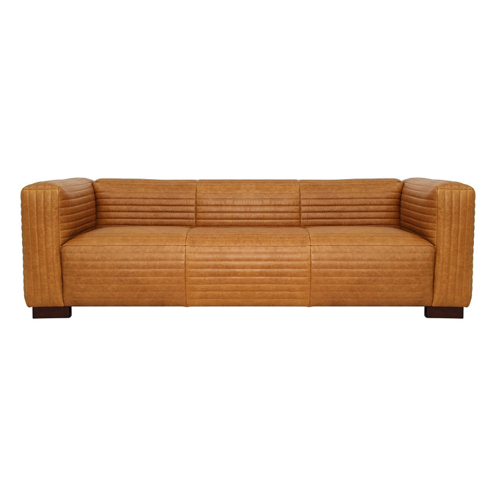 The Strata Sofa in Latte brings a touch of elegance and comfort to any living space. Made from durable rubberwood and wrapped in rich brown leather, this sofa exudes a modern charm with its sleek, rectangular design. Wide armrests provide additional relaxation, while ribbed upholstery adds a hint of subtle texture. The dark wooden legs offer a sturdy foundation and complement the sofa's contemporary style. Perfect for gatherings or simply lounging, this sofa is a versatile addition to your home. Its thoughtful design and quality materials ensure that it not only looks good but also stands the test of time.