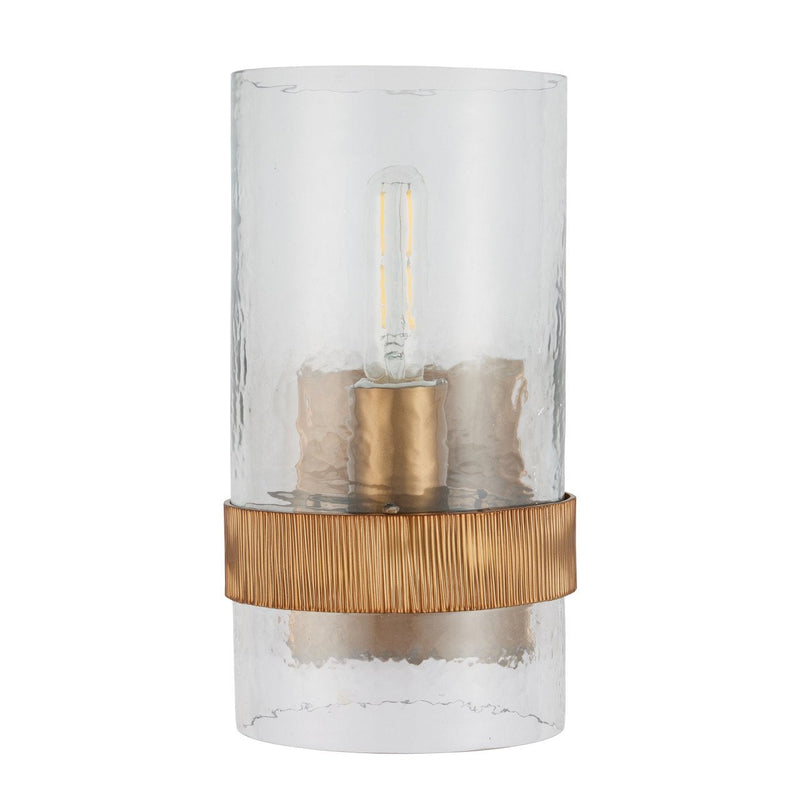 The Sudeley Wall Sconce features a cylindrical canister shade made of thick hammered glass that gives the piece both weight and texture. The glass is secured by a reeded iron band in a satin brass finish, adding a refined accent. Its wallplate has square edges that emphasize a modern profile, while the substantial glass shade diffuses the light with a soft, dappled glow. The one-light sconce is dimmable, and there will be subtle variations in the hammered glass from fixture to fixture.