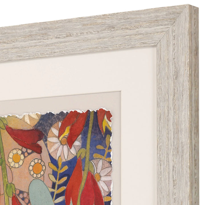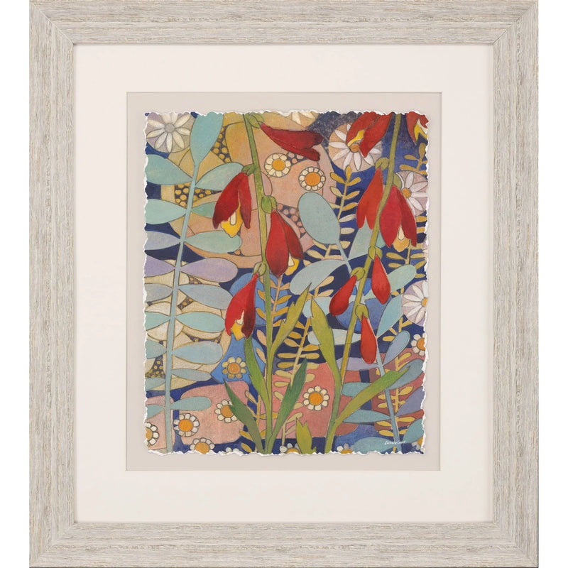 Flowers blend beautifully in a psychedelic design. This artwork brings vibrant colors to life, featuring red flowers, leaves, and abstract patterns. The hand deckled print gives it a unique edge, offering an attractive blend of red, blue, green, and yellow hues. Mounted on putty and matted in white, it creates a fresh and lively focal point for any room.