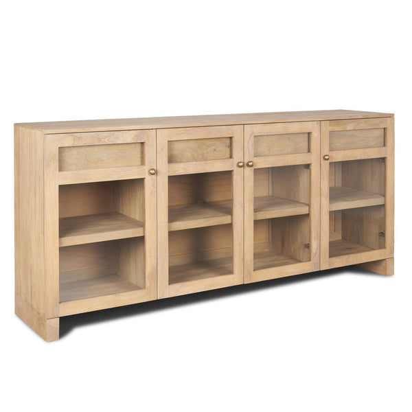 Glass-front storage cabinets occupy a unique space in furniture -- they need to be substantial enough for serious storage yet elegant enough to display your best pieces behind those transparent doors. The Mercana Suri Three Drawers Wood Sideboard is an 80-inch Contemporary solid mango wood credenza built for dining rooms that need both hidden storage and display space, available at LOOMLAN with free shipping to the continental US. This handcrafted piece solves the common problem of finding storage that's both functional and show-worthy, with four clear glass doors revealing what's inside while three drawers keep less photogenic items tucked away. The light brown mango wood finish brings warmth without overwhelming a space, and the gently sandblasted texture adds tactile interest that you won't find in mass-produced alternatives. With solid brass hardware and 36 inches of height, it's sized to work as both dining room storage and living room media display -- a flexibility that makes it worth the investment for homes where every piece needs to earn its place.