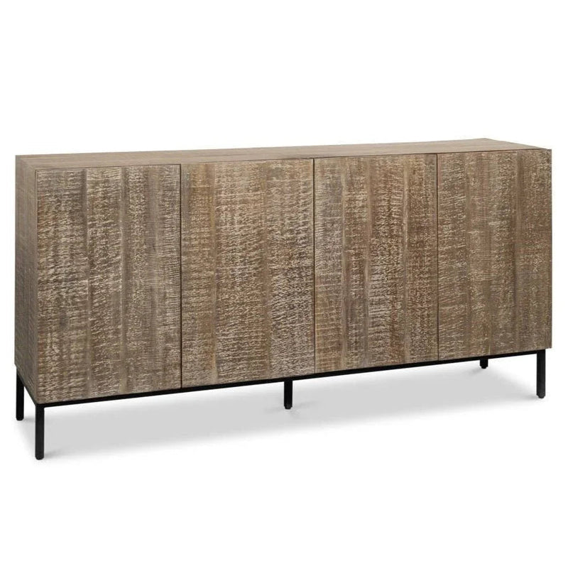 The Suzette Four Door Wood Sideboard seamlessly merges modern and vintage aesthetics with its refined silhouette and textured finish. Constructed from reclaimed hardwoods, including mango wood and distressed oak, it offers lasting durability alongside rustic warmth. Its brown tones and natural wood texture create an inviting atmosphere, while the minimalist design and black metal legs introduce a contemporary edge. Featuring four doors and two removable shelves, this sideboard provides versatile storage tailored to your needs. Ideal for dining rooms, living areas, or hallways, the Suzette Sideboard combines functional elegance with timeless style.