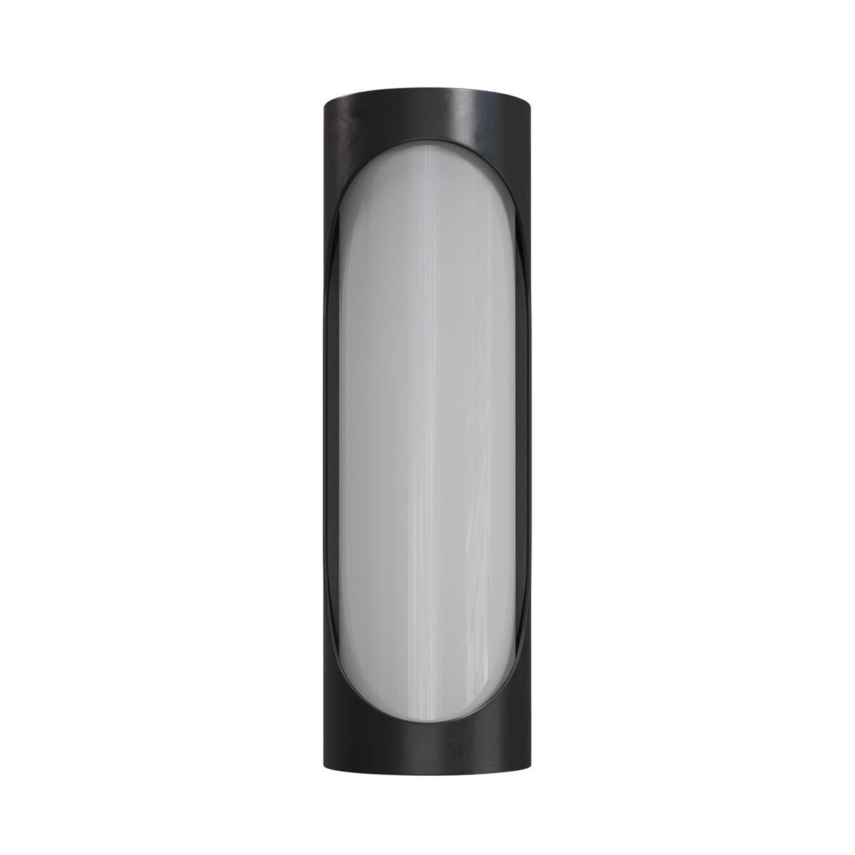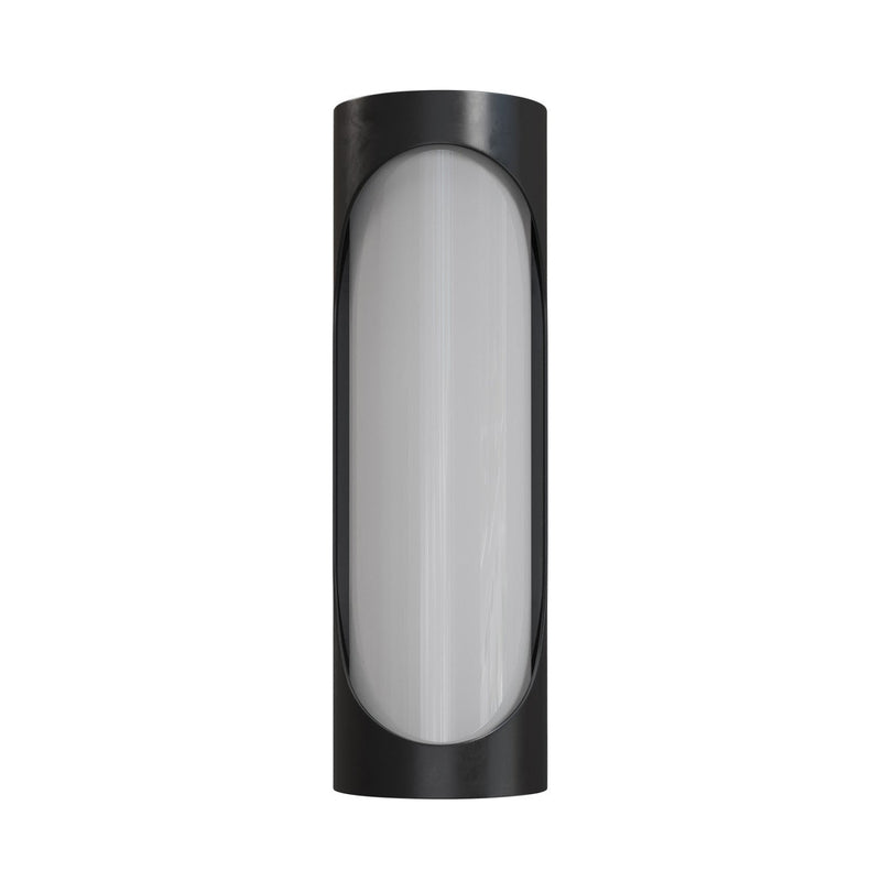 The Swale Large Outdoor Wall Sconce has a graphic silhouette with cut outs where illumination can escape. The front of the black sconce is covered with a milky white glass that illuminates uniformly when the integrated LEDs shine through it. The metal is powdercoated to make this outdoor sconce weather worthy.