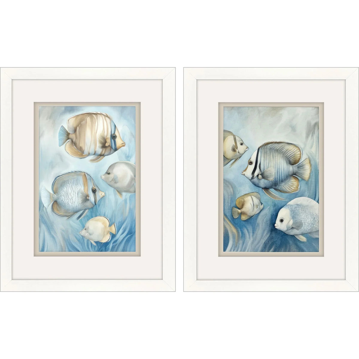Transform your living space with this elegant set of coastal artwork. The Swim S/2 Coastal Art Set features two stunning tropical fish prints in soothing blue hues, perfectly capturing the tranquility of underwater life. Each piece is enhanced with raised white matting, adding a touch of depth and sophistication to your decor. The block profile moulding in a matte white finish frames the prints beautifully, making them a perfect fit for any coastal-themed room.