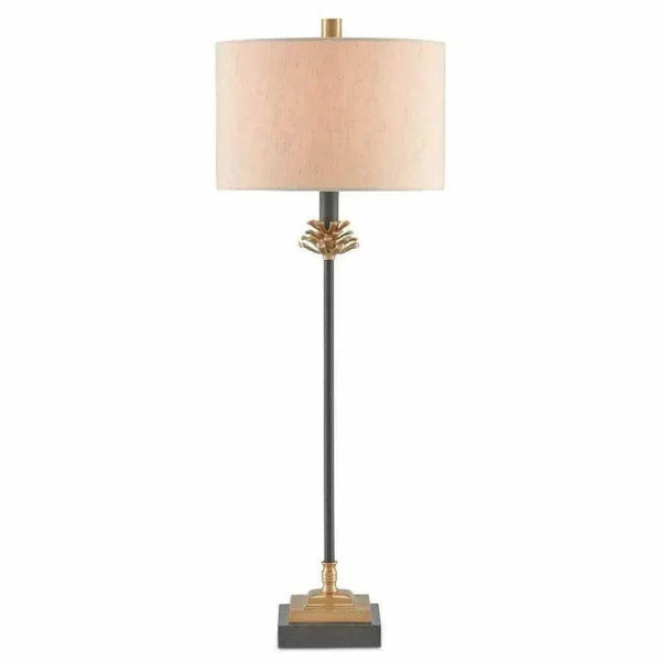 The Pinegrove Table Lamp has a black wrought iron column that extends between a spreading pinecone accent in an antique brass finish and a stacked base in brass and black granite. The beige poplin shade on the dark gray lamp is fastened by a finial in an antique brass finish.