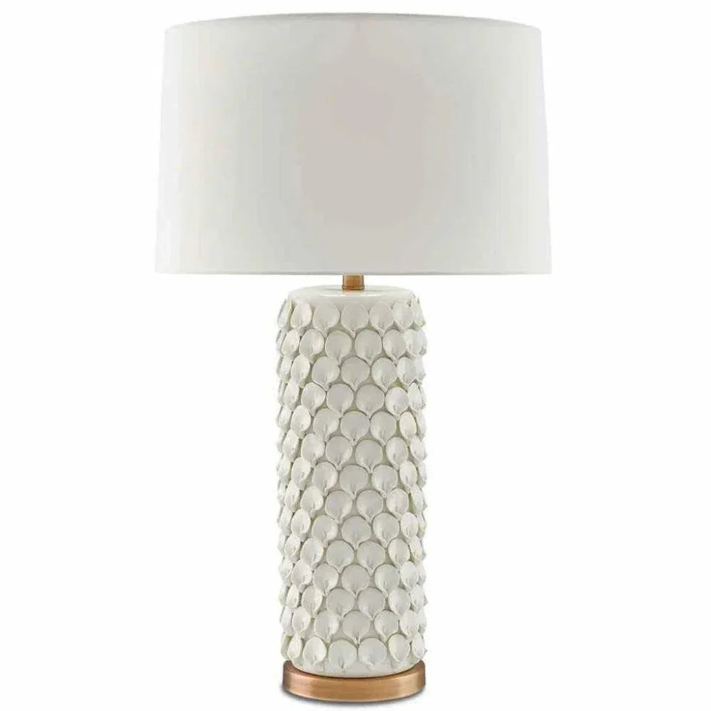 Intricate hand-formed ceramic flower petals cover the surface of the Calla Lily Table Lamp. The textural interest of the petal-covered column is heightened by the antique brushed-brass accents. The white lamp is topped with an eggshell shantung shade that completes this pretty composition.