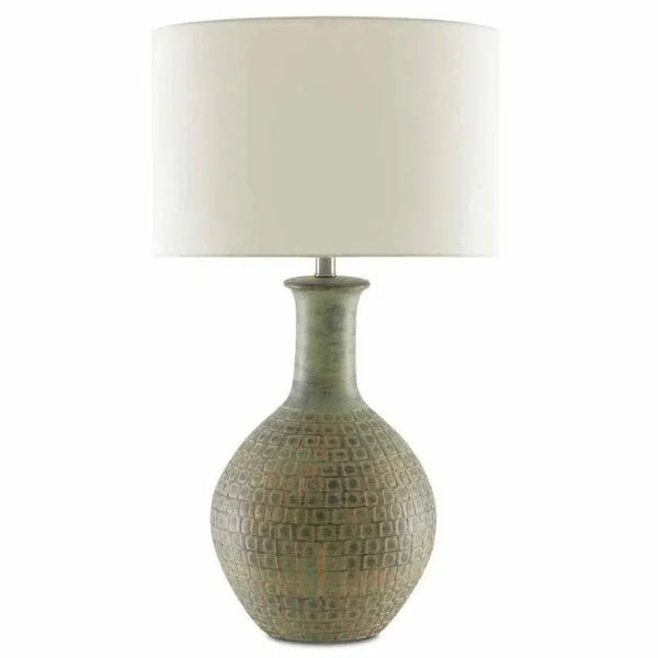 The Loro Table Lamp is made of terracotta with a distressed dark moss green and gold surface. Stamped into the body of the green lamp are artful squares to bring it a textural appeal. The Loro is topped with an ivory shantung shade.