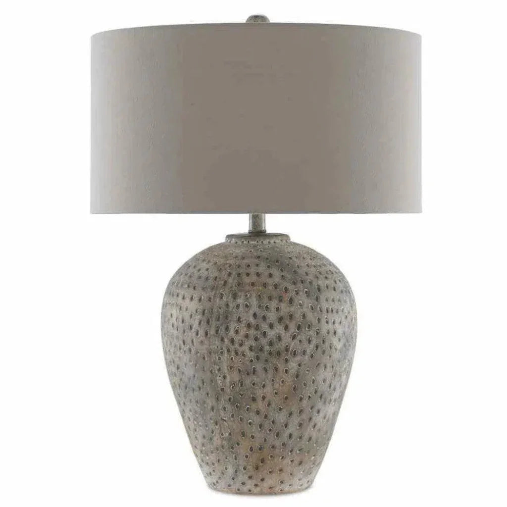With meticulous attention to detail, they have perfected the earth gray finish to achieve its aged aluminum appearance. The random piercings and darkening of the glazing create a torch-like effect that adds to the lamp's industrial charm. Topped with a light gray linen shade, this lamp is a true masterpiece. Elevate any space with the sophistication and exclusivity of our Earth Gray Junius Table Lamp.