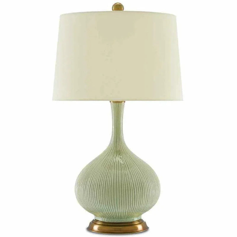 The vase-like shape of the Cait Table Lamp is crafted from striated ceramic in a delicate grass green hue with a textured finish. The paleness of the color is complemented by the antique brass base, hardware, and orb-like finial. Topped with a tan sand linen shade, this lamp is a spectacular blend of hues and textures, with elegant green ceramic and antique brass details. The soothing color of the ceramic brings a calming effect, while the antique brass adds a touch of opulence. The sand linen shade adds a soft touch, making this lamp a sophisticated and exclusive addition to any room.