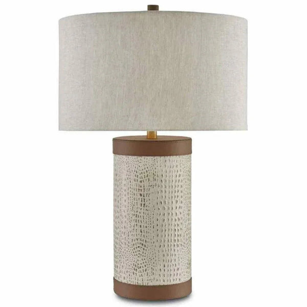 Beautiful genuine leather embossed with a crocodile pattern wraps the column of the Baptiste Table Lamp. The cylinder is capped at both ends with rich coffee brown leather that complements the warm brushed brass details. A natural linen shade tops this brown leather lamp.