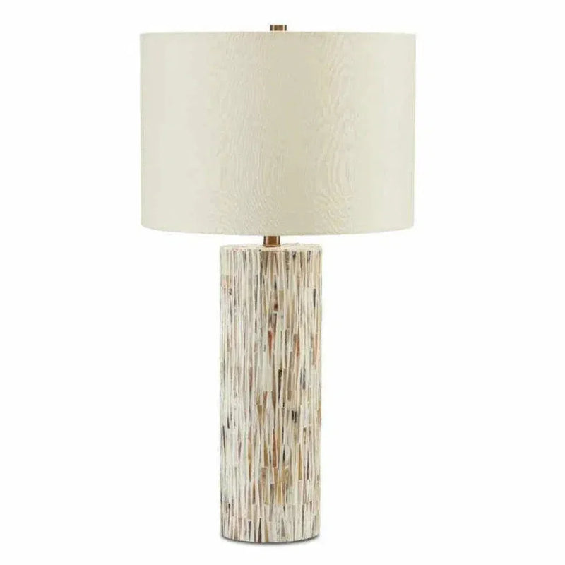 Introduce an air of opulence to your surroundings with the Natural Bone Antique Brass Aquila Table Lamp. Made from composite material with a stunning natural bone mosaic pattern, this lamp exudes sophistication. The antique brass hardware and finial provide a striking contrast to the beige body, while the white drum shade adds a touch of elegance. Illuminate your space with an elemental freshness and rich texture. The Aquila Table Lamp is crafted from composite material, featuring a beautiful natural bone mosaic that runs along its cylindrical body, creating a luxurious and exclusive feel.