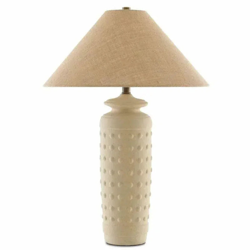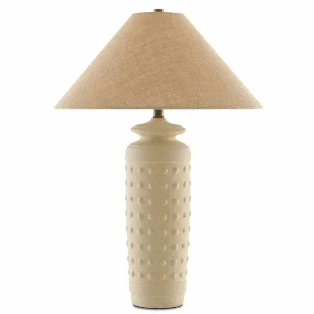 Transform your space into a haven of elegance with the Sand Brass Sonoran Table Lamp. Crafted from premium terracotta in a sand hue, its matte finish features rows of raised circles for a touch of sophistication. Crowned with a natural burlap shade, this exclusive lamp exudes a sense of art-inspired refinement in your home decor. The matte surface of the Sonoran Table Lamp adds a touch of understated opulence.