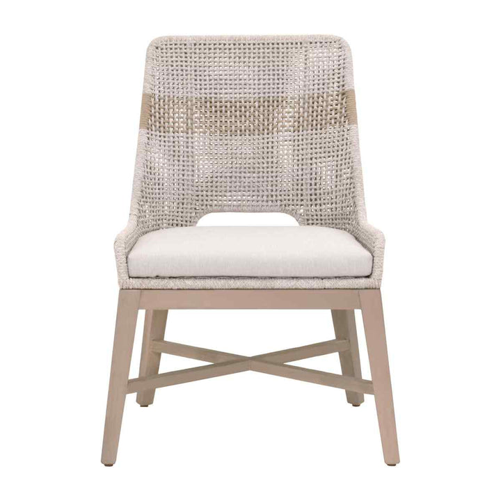 Introducing our Tapestry Outdoor Dining Chair Set of 2, crafted with a sturdy stainless steel frame and solid teak legs. The woven taupe and white-dove rope design exudes a hint of coastal elegance, while the all-weather seat cushion offers both comfort and style. Elevate your outdoor dining space with Woven Collection's sophisticated "Gray Teak-Washed Ever Teak" chairs. The chairs' intricate woven design is complemented by the durable stainless steel frame and solid teak legs, making them perfect for outdoor use. The rope features a rich taupe and white color scheme, with a striking solid stripe interwoven in the center of the seat back. The crossed leg stretchers and beautiful wood grain finish of the teak legs add to the chairs' exclusive appeal.