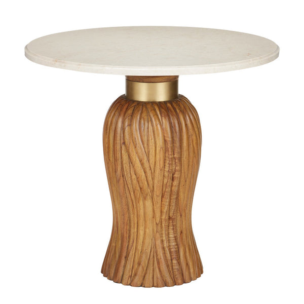 The hand-carved wood base of the Tassel Entry Table is a study in movement, with its flowing lines that imitate strands of thread. The Mindi wood from which it is made and the brass collar in a brushed brass finish bring the wood accent table warmth, while the Crema Marfill marble top is a nice contrast in its paleness.
