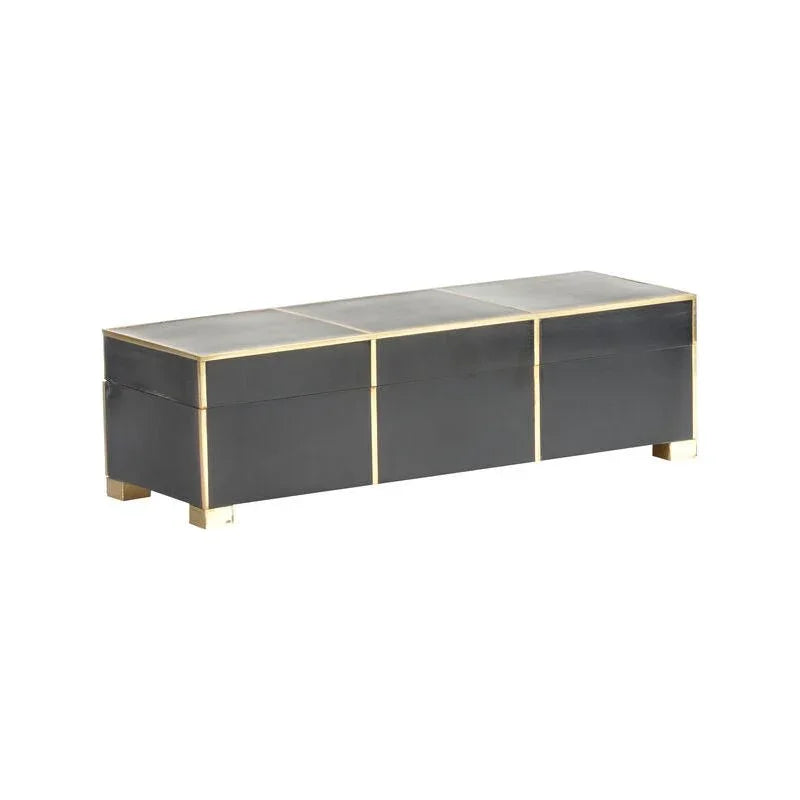 This small rectangular box is crafted from durable resin and accented with brass detailing. It offers a stylish blend of modern design and timeless elegance, making it a perfect addition to any space. The sleek black and white color adds a touch of sophistication, while the brass accents provide an elegant contrast. Whether placed on a dresser, desk, or shelf, this box is sure to enhance the aesthetic of its surroundings. The box is not only decorative but also functional. It is ideal for storing small items, helping to keep your space organized and clutter-free. Its compact size allows it to fit easily in various spaces, making it both versatile and convenient.
