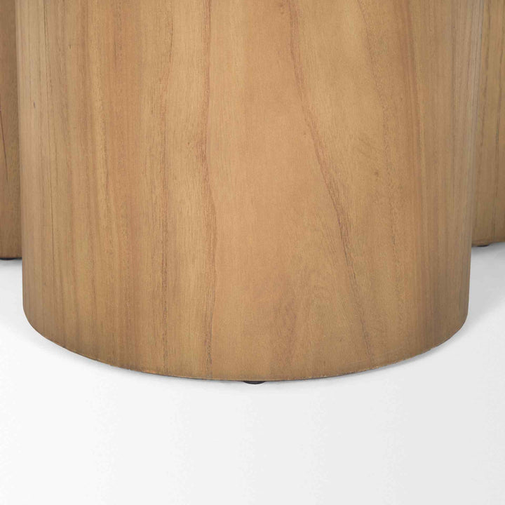 The Tavi Medium Brown Round Coffee Table is a perfect addition to any home that values both style and functionality. Crafted from solid wood and finished with a rich elm veneer, this coffee table offers a smooth, medium brown hue that adds warmth and elegance to any room. The table features a unique design with three sleek cylinder columns, meticulously carved to create a sculptural base. This distinctive structure makes the Tavi table not only a functional piece of furniture but also a striking art piece that draws the eye and complements modern and retro interiors alike.