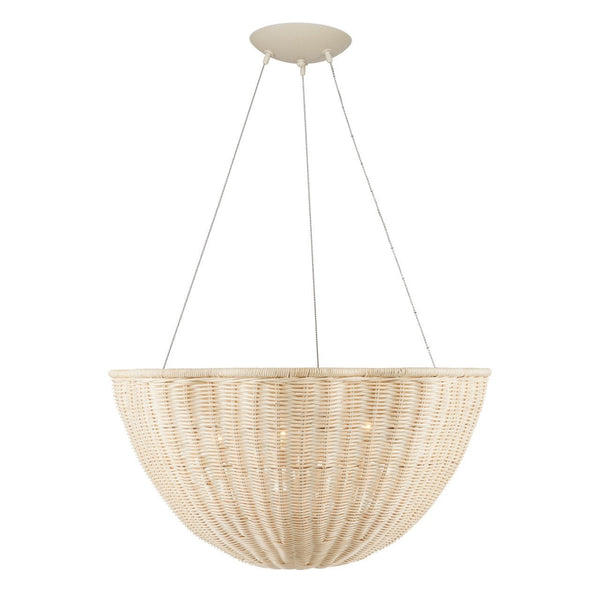 The Telos Pendant is made of wicker that has been bleached for a lighter feel. The beige pendant is perfect for spaces where an abundance of uplight is needed. The wicker pendant with its bowl-shaped profile is scalloped, though this is not obvious when viewed from the side. Given the nature of the woven natural material, pinpoints of light will waft through in spots.