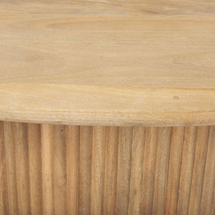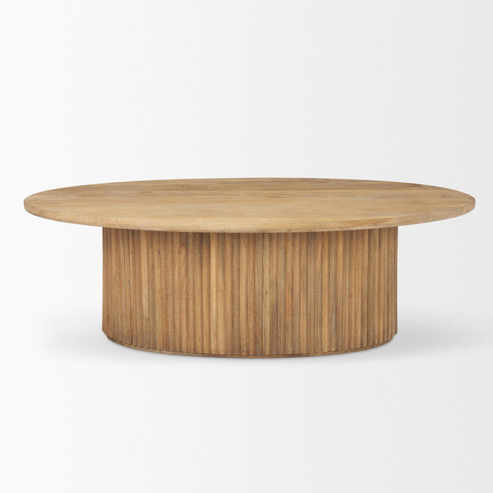 The Terra Wood Oval Coffee Table is a charming addition to any living space. Crafted from solid mango wood, it showcases the natural beauty of the wood grain on its oval tabletop. This piece is not only a visual delight but also a functional one, thanks to its clever design. The fluted, ribbed base adds a touch of modernity, making it a standout feature in your room. The warm brown color complements various decor styles, ensuring it fits seamlessly into your home.