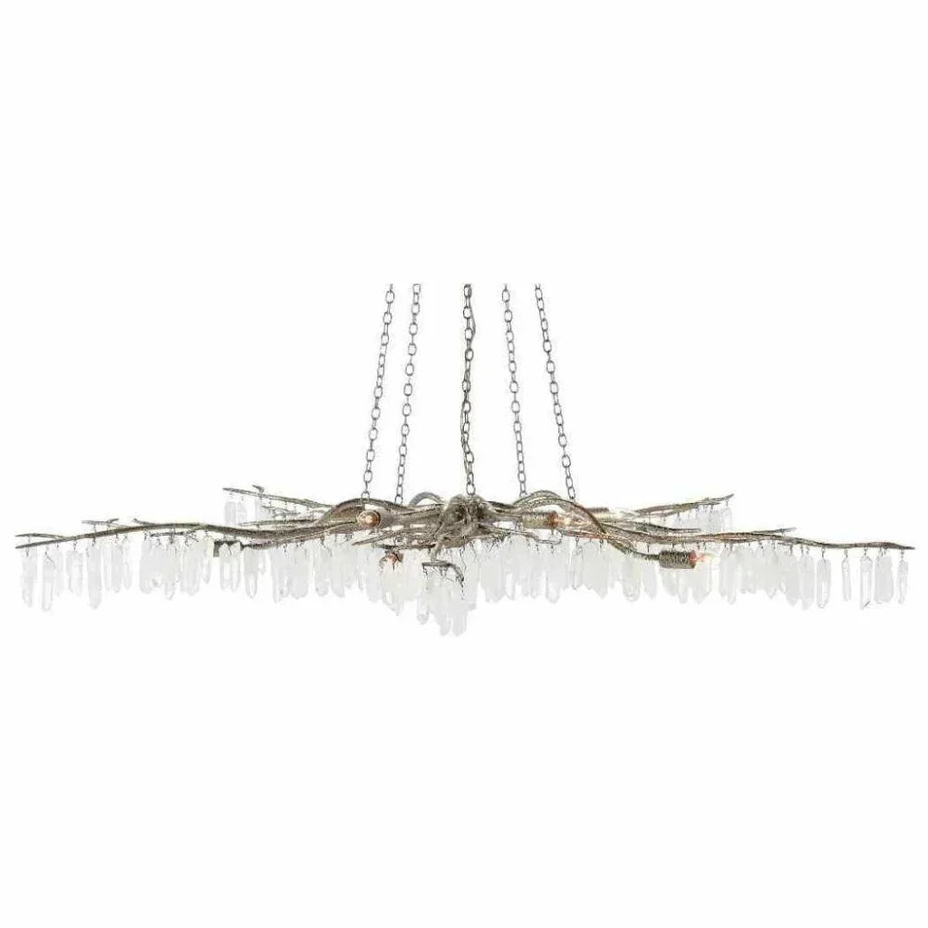The Forest Light Silver Chandelier is an exceptional work of art dripping with quartz crystals. The textured silver finish is a perfect complement to the quartz on this sculptural ten-light chandelier. Adjustable from 18" to 81" with use of included chain/rod kit/cable. If your space calls for a longer drop, additional chain/rods/cable is available for purchase.
