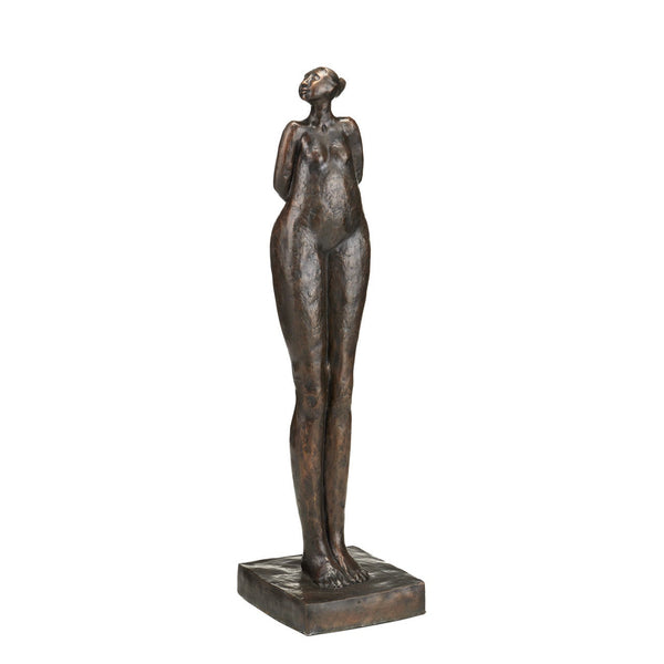 The Tall Empress Bronze is an overscale sculpture standing nearly 43 inches high. Cast in bronze, the figure is depicted with generously proportioned legs, a somewhat defiant stance, and a posture that suggests she is listening with rapt attention. Full of presence and character, this decorative accessory brings tremendous personality to a space.