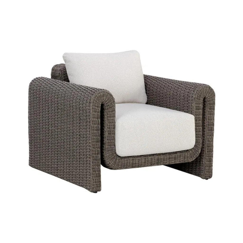 The robust proportions of the Tibi Lounge Chair enhance the textural beauty of handwoven twisted wicker. The rolled arms join seamlessly to nestle the comfortable cushioning upholstered in our Louis Cream outdoor boucle performance fabric.