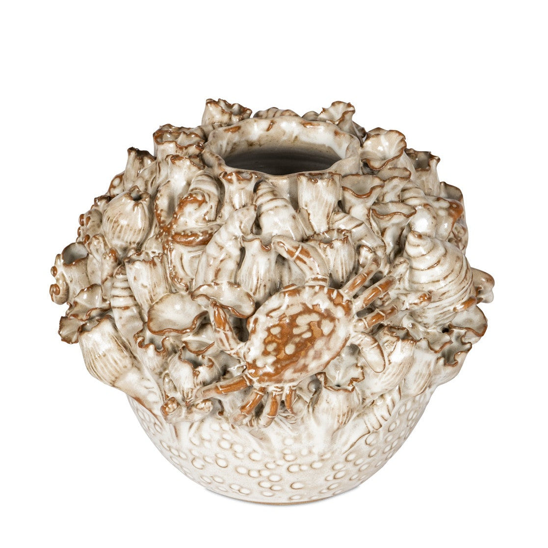 The Tidal Medium Vase carries an underwater theme, with carved depictions of crabs and an octopus wrapping around its surface. Made of dark clay ceramic in a milky white finish, each vase is individually thrown, carved, decorated, and glazed by a community of women artisans. Not watertight, the piece should be lined before use, making it as much a work of art as a functional vessel. Due to the artisanal finish and unique placement of the decorations, each accessory could differ slightly.