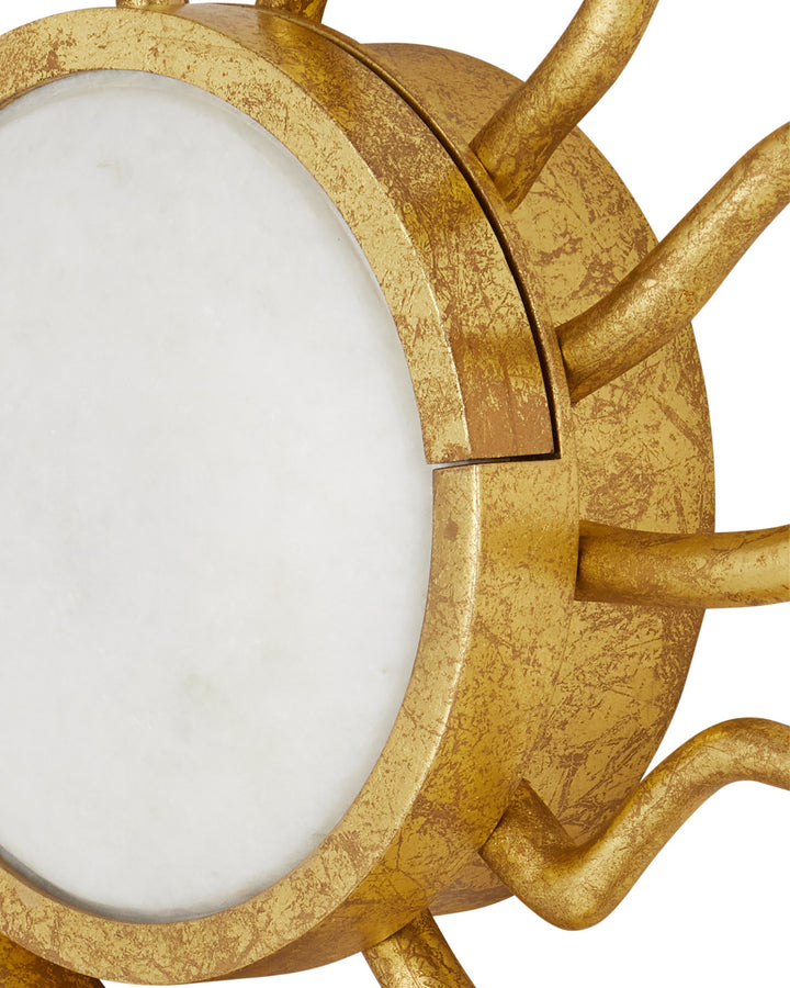 The Tona Wall Sconce captures the elegance of a bygone era with its celestial design, crafted by Marjorie Skouras. Inspired by a vintage brooch, this sconce features a bold and expressive motif. Made from durable iron with a gold leaf finish, it presents wavy, sunburst-like rays that create a striking visual impact. The central white marble disc adds a touch of sophistication, offering a soft and warm glow when lit. This unique combination of metal and marble makes the Tona not just a light source, but also a stunning piece of wall art.