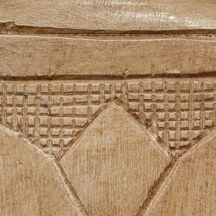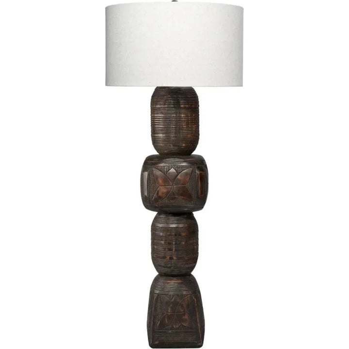 The Totem Floor Lamp is a handcrafted work of art, made by skilled artisans in India's Naga region using hand-selected mango wood. Each lamp features timeless carved motifs that are both decorative and evocative, showcasing the region’s rich tradition of wood craftsmanship. Available in bleached or dark brown finishes, the one-of-a-kind base is paired with a natural polyester linen drum shade and topped with a matching carved wood finial. Combining artistry and functionality, this lamp adds depth, character, and warm illumination to any interior.