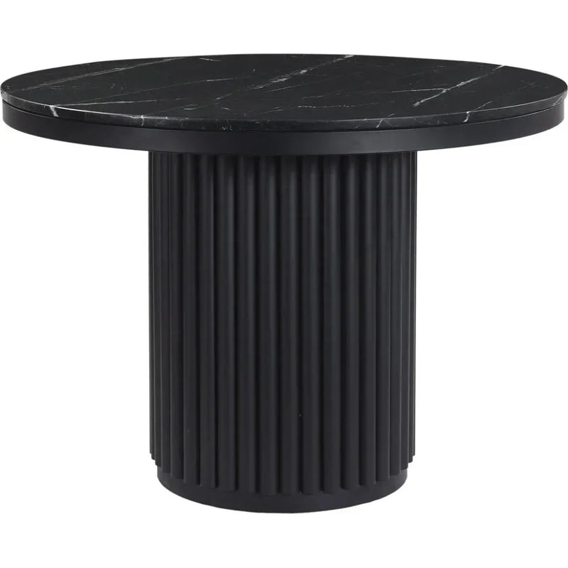 Inspired by Roman architecture, the Tower dining table features a black-finished pillar base holding up a beautiful black marble top. This classic yet modern design, which seats two to four people, is a welcome addition to any contemporary home. An elegant centerpiece that fuses traditional and contemporary styles flawlessly, this table boasts a sturdy black marble surface atop a robust Roman-inspired base for long-lasting durability. Its compact size makes it versatile and perfect for a small gathering or intimate dining.