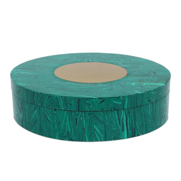 The Transformation Box is a 12-inch round decorative box made of composite in a marbled green finish that resembles malachite. A brushed brass disc accents the center of the lid, adding a polished detail. The interior is finished in glossy black, providing a sleek contrast to the richly patterned exterior. Because it is made of an artisanal material, its surface may vary slightly from box to box.