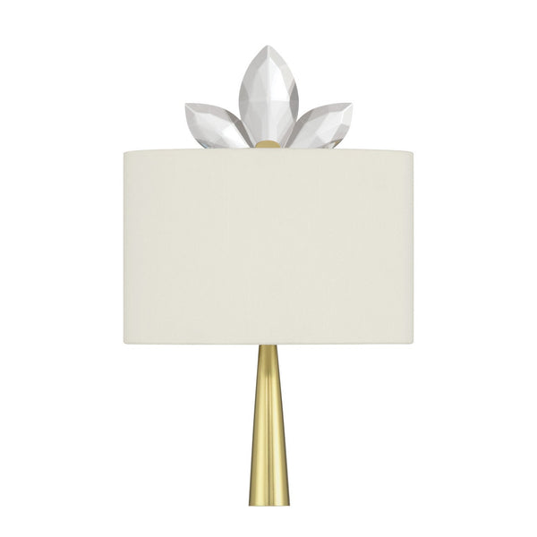The Trillium Wall Sconce is made of brass in a gold finish and accented with three optic crystals that extend above the shade like a blooming flower. Its narrow profile means the design is ADA compliant, while a simple stem extends below the shade for a clean, understated detail. The Trillium is dimmable to create softer moods after sunset when a muted ambience is desired.