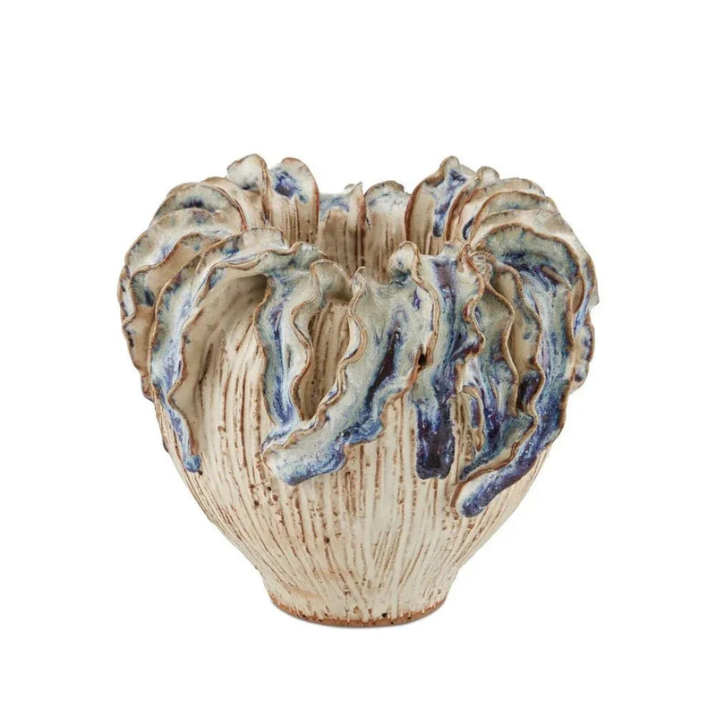 The Tropical Crown Small Ceramic Vase showcases nature-inspired elegance and artisanal craftsmanship. This vase, measuring 6.25 inches tall and 6.5 inches in diameter, boasts a round shape with irregular edges, a rustic textured finish, and an organic wave-like design. It is handcrafted using the meticulous pinch method by skilled women artisans, ensuring each piece is unique.