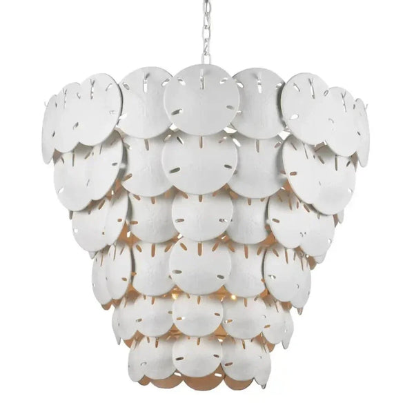 Cleaning is made simple with three sizes of removable sand dollars. This feature, combined with the chandelier's nature-inspired design, makes it not only beautiful but also practical. Weighing 47 pounds, it is sturdy yet refined, adding sophistication to your home. The Tulum Extra Large White Chandelier is an exquisite choice for those seeking to bring a touch of the coast indoors.