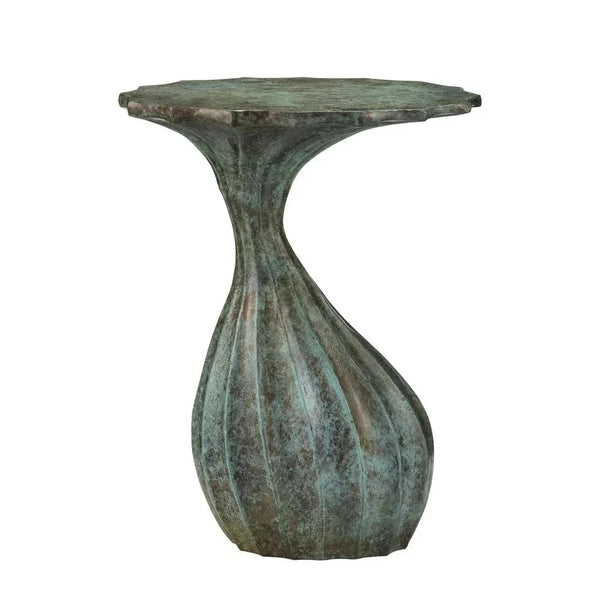 The Tunis Accent Table brings a charming blend of rustic style and artistic craftsmanship to any room. Crafted from cast aluminum, this table features a faux verdigris finish that gives it an elegant, timeworn look. Its mottled surfaces have a subtle sheen, enhancing its unique character. The hourglass shape and round tabletop create a pleasing silhouette, while the ribbed texture adds an extra layer of visual interest. Ideal for those who appreciate fine detailing, this accent piece promises to lift the aesthetic of your living space.