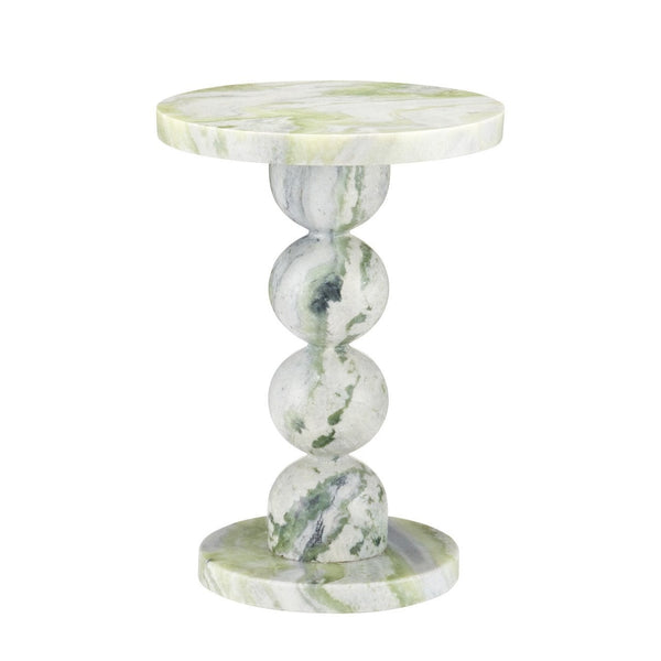 The Turner Green Onyx Accent Table is a stunning piece that brings nature's art into your home. Crafted from green onyx marble, this table displays beautiful veins of green, gray, and beige, making each one-of-a-kind. The polished finish enhances its natural hues, adding a touch of elegance to any room. This accent table features a pedestal designed to look like stacked spheres, giving it a refined and modern look. It gracefully rises from a round base to a slightly larger round top, offering a perfect spot to place your favorite decorative items.