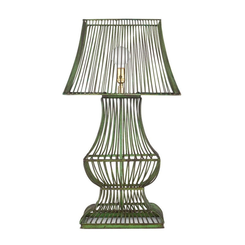With a profile made of strips of iron that have been finished in a distressed green verdigris, the Tuteurs Table Lamp and its ribbed shade form a shapely cage around the bulb. The complex process required to create this lamp takes painstaking concentration to ensure that the ribs of metal are cut uniformly and applied to the cross-bars consistently. Once in place, the entire green lamp is hand-finished. The material and the distressing call to mind an antique garden artifact. Due to the artisanal finish, the surface of each lamp could differ slightly.