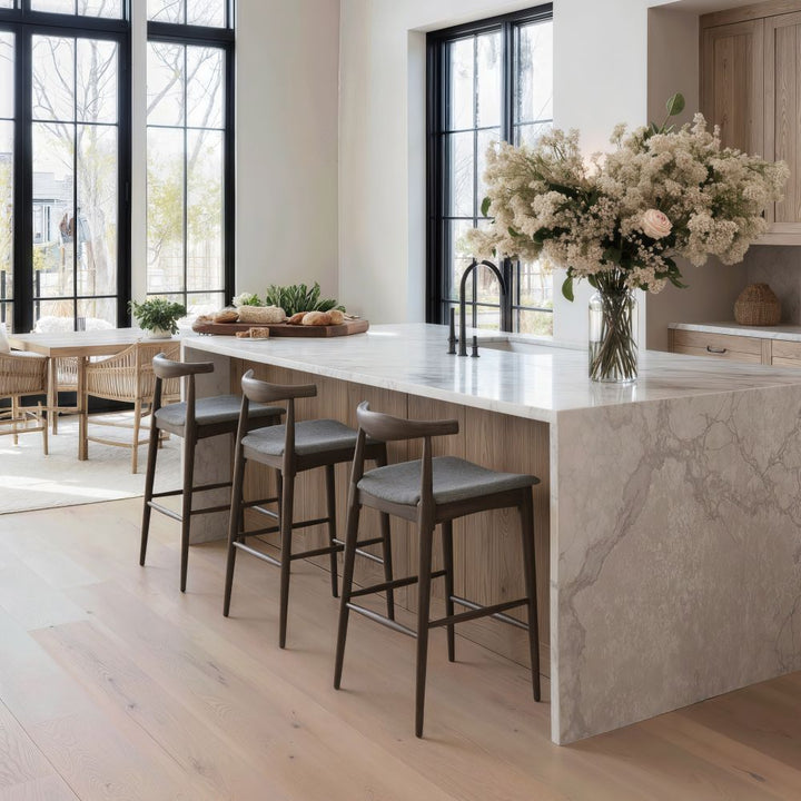 The Tuzka Barstool Set of 2 in Grey & Espresso brings a modern touch to any room. Crafted from high-quality polyester fabric and strong rubberwood, these stools are both stylish and practical. The chic design is perfect for contemporary homes, adding a sleek look to kitchens or bar areas. With a comfortable seat height and smooth finish, the Tuzka Barstool enhances your space while providing a comfortable place to sit. Whether you're entertaining guests or enjoying a quiet morning coffee, these stools offer a blend of comfort and style that's hard to beat. Easy to assemble, they are a smart choice for any modern setting.
