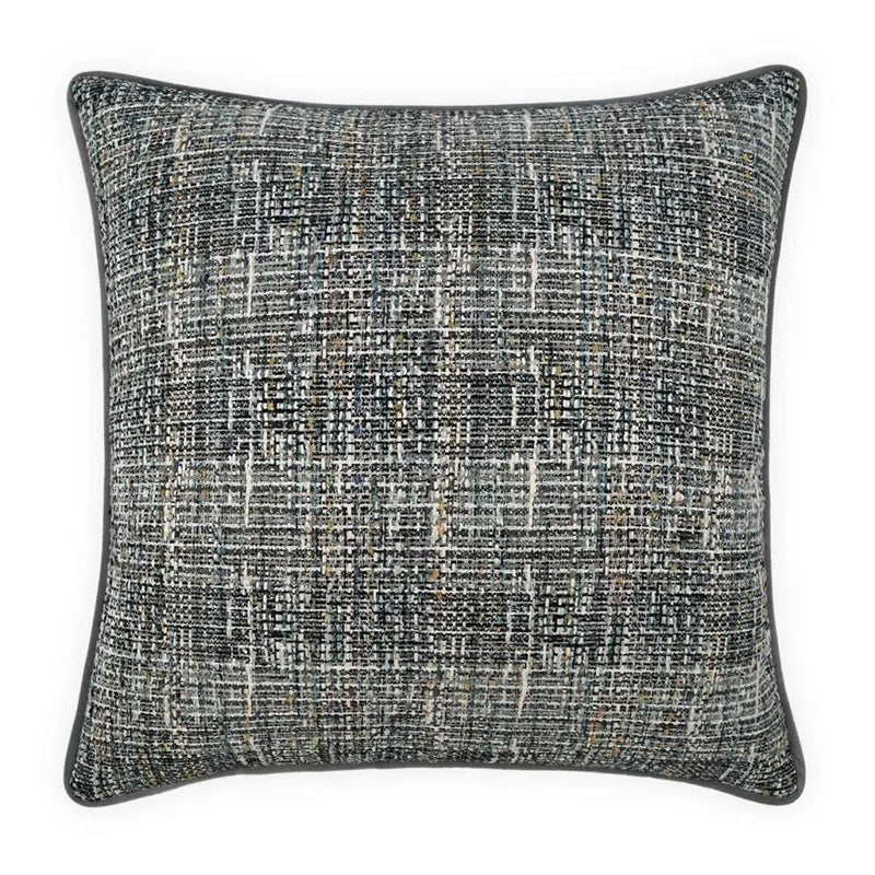 The Underwood Pillow brings an elegant touch to any living space. Its square shape and textured woven pattern showcase a subtle plaid design with shades of black, gray, white, and hints of blue. The handcrafted quality is evident in every stitch, with each pillow being hand cut and sewn to order in California. The dark trim complements the multicolor palette, making it a versatile addition to any decor style. Its soft, inviting fabric blend includes organic cotton, recycled polyester, acrylic, and polyester, offering a comfortable yet durable choice for your home.