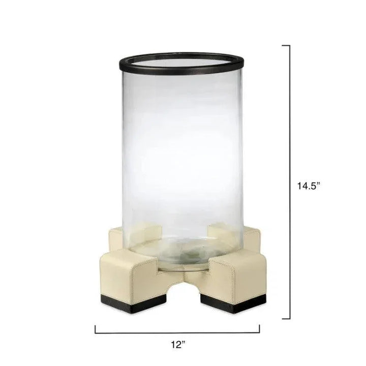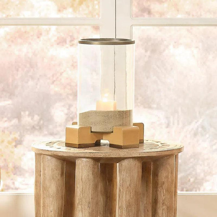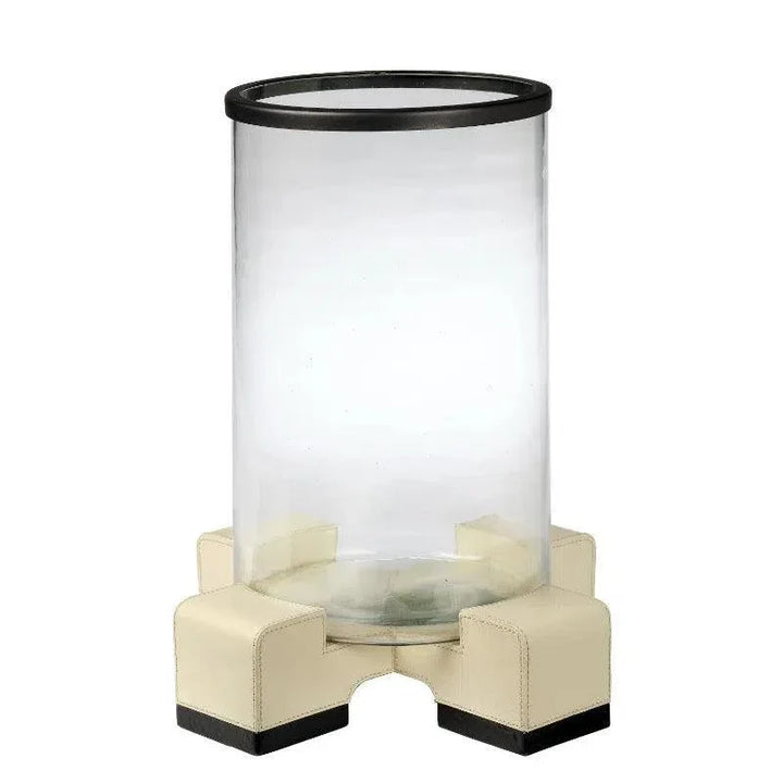 The Vector Hurricane adds a touch of elegance and modern sophistication to any room, blending sleek design with elemental materials. Featuring a hand-blown glass cylinder to protect the candle’s flame, its base is wrapped in luxurious leather—available in creamy cashew brown or ivory white—and accented with burnished brass or black metal trim. Customize your look by choosing an ivory pillar candle for a classic monochromatic style or a colored candle for contrast. The black Triton fabric bottom prevents surface scratches, making this hurricane both stylish and practical. Perfect for creating a serene, refined atmosphere indoors.