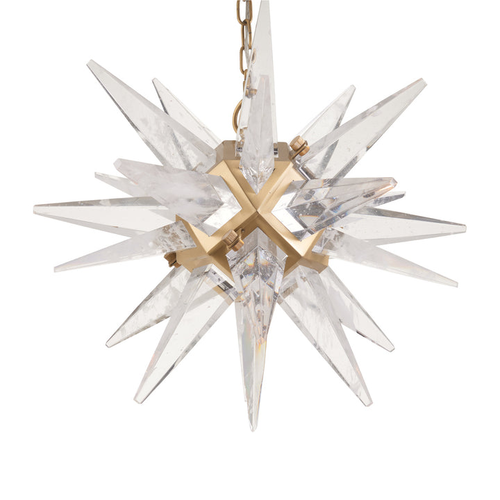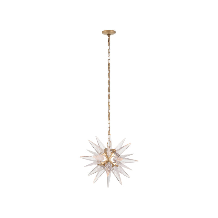 The Vela Pendant Light brings a touch of celestial beauty to your home. With its modern starburst design and polished gold finish, it catches the eye and adds elegance to any room. This pendant light is crafted from a mix of metal and glass, featuring clear crystal spikes that enhance its luminous appeal. Its sculptural shape creates a striking focal point, while the included 6-foot chain offers flexibility in hanging height. Perfect for dining areas, living rooms, or entryways, this light fixture fits seamlessly in any modern decor, providing both style and illumination with a single bulb up to 60 watts.
