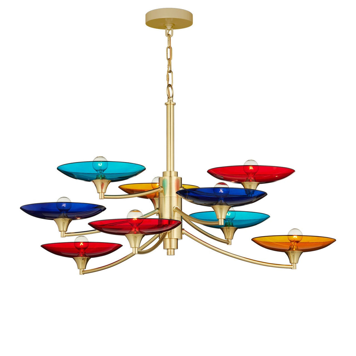 The Veneto Medium Chandelier, which has mid-century Italian lines, is made of metal in a polished brass finish. Sitting atop arms that arc outward are colorful glass discs in blue, yellow, and red, each of which is more translucent than traditional colored glass so that light will shine through better. The Milano-inspired gold chandelier has nine lights that will make each bowl-like element shine. This fixture is dimmable.