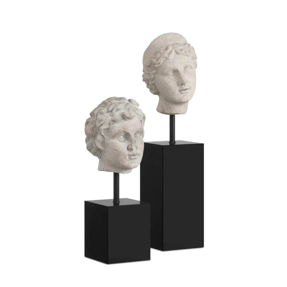 The Venus Head on Stand Set of 2 brings a touch of timeless elegance to your home. Designed to resemble ancient stone carvings, these sculptures are crafted from a durable composite material that mimics the look of stone with a sophisticated mix of beige and pale gray finishes. Each head is beautifully detailed, capturing classical European traditional style. The Venus heads are mounted on sleek, black optic crystal stands, giving them a museum-quality appearance that enhances any room. Their minimalist design and intricate facial details make them stand out as unique decor pieces.