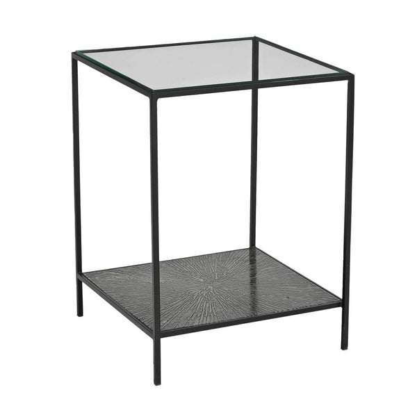 Iron creates a sturdy and stylish base for the Venus Side Table in Black. This table features a sleek black iron frame that not only looks modern but also ensures strength. The tabletop is made from 10mm tempered glass, which is durable and safe for everyday use. There's a textured black lower shelf with an etched radial pattern that adds a unique touch and provides extra storage. Its minimalist design makes it perfect for a variety of spaces, whether in the living room or as a bedside companion. Ideal for indoor use, this table blends functionality with a chic aesthetic.