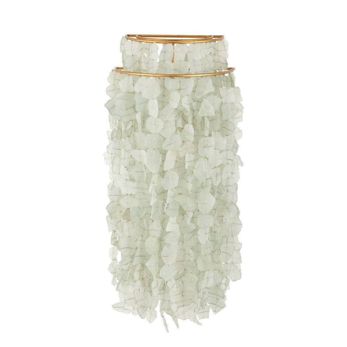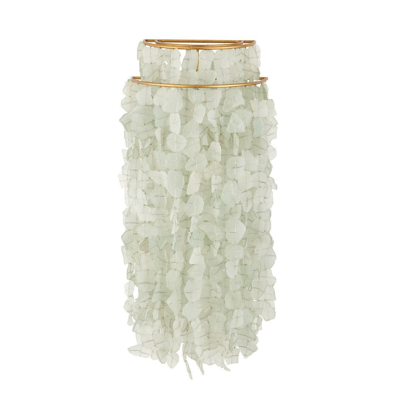 The Verre de Mer Wall Sconce has a cascading shade made of sand-blasted glass that was hand-cut from recycled bottles to resemble seaglass. Each piece of this sustainable material is attached to the frame by hand, the wires wrapping around each requiring patience and precision to affix. The round metal frame, in a contemporary gold finish, holds layers of very pale glass that are illuminated by a single tall bulb to provide uniform light. The sconce is dimmable.