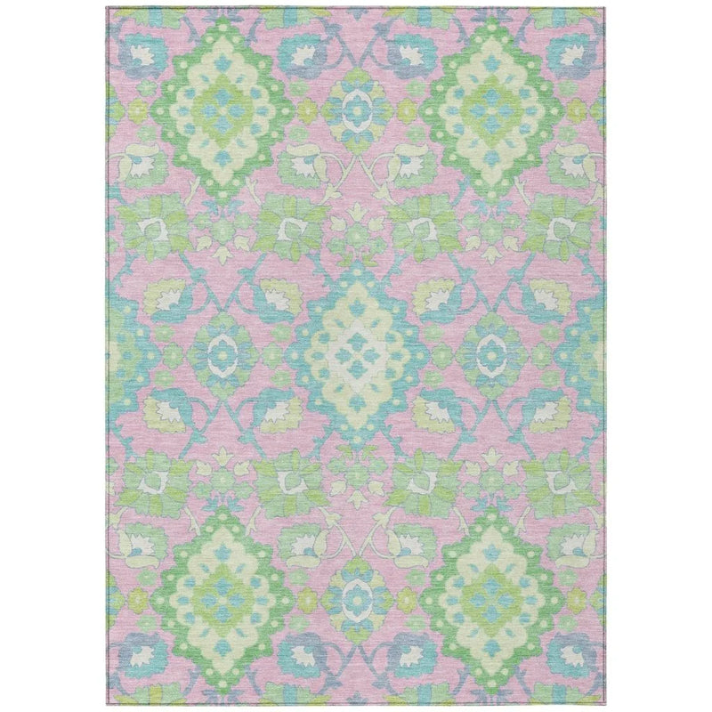 The Vespera Pink Washable Rug is a stunning addition to any space with its large damask medallions and classic trellis pattern. The elegant oriental design brings historical charm and sophistication to your home. This rug's pink hue adds a touch of warmth, enhancing the aesthetic appeal of both traditional and modern interiors. Whether placed in a living room or outdoor patio, it elevates the ambiance with its timeless elegance.