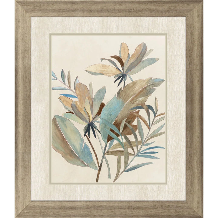 Transform your living space with a touch of nature-inspired elegance. This artwork features tropical leaves in soothing blue and brown hues, designed to bring a coastal charm to any room. The botanical image is set against a backdrop of premium matting, enhancing its visual appeal and adding depth to the piece. The combination of soft beige, brown, blue, and green tones makes it a versatile addition to various decor styles, blending seamlessly with existing interiors.