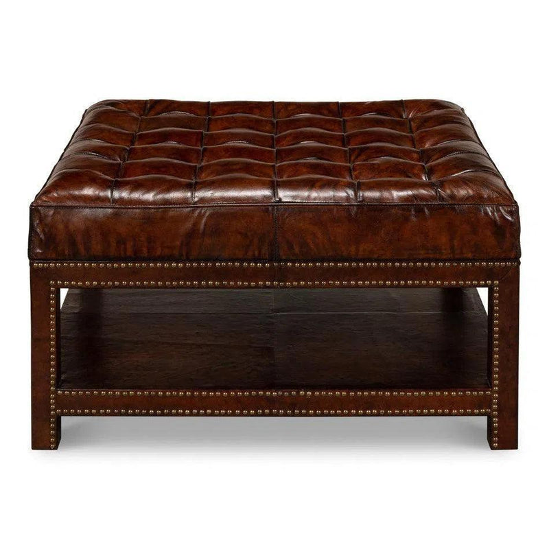 Take a daring leap with the Vintage Tufted Ottoman. This 36 inch square ottoman boasts a rich old brown leather that is deeply tufted and trimmed with brass tacks for a vintage-meets-contemporary style. With its solid hardwood frame, this piece is built to last and impress for years to come. Use it as a footrest, extra seat, or coffee table to add versatile charm to any space.