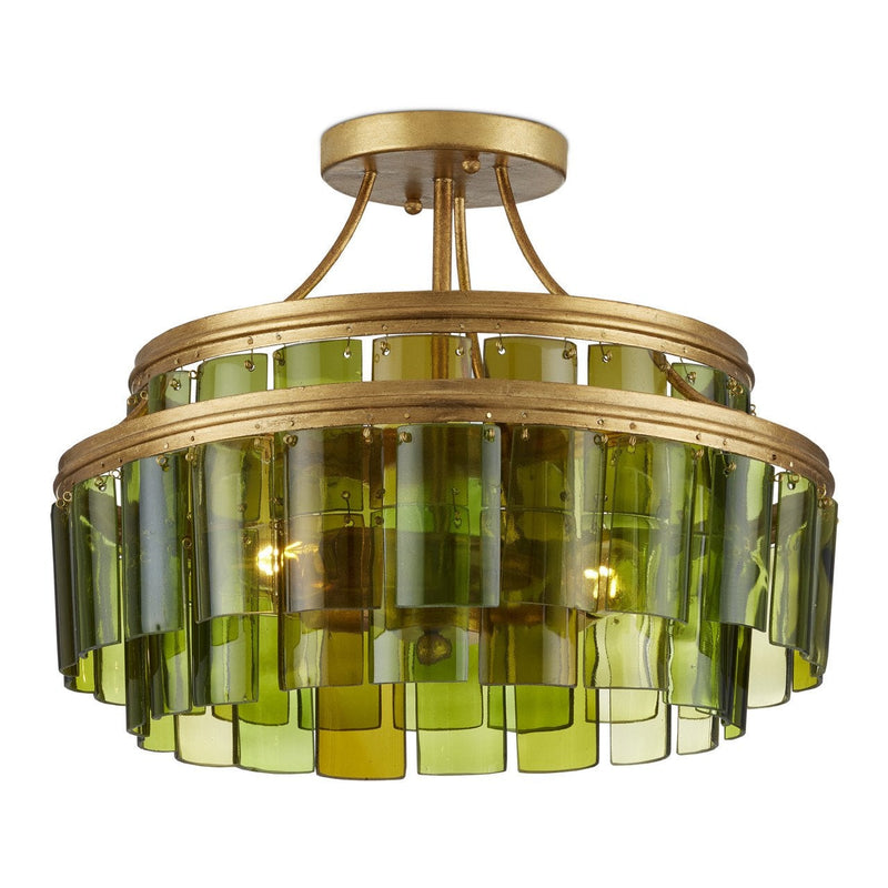 Cascading from the circular frames of our Vintner Green Semi-Flush are individually-cut pieces of green glass made from recycled bottles. The texture created by the varying hues of the glass beautifully complements the dark contemporary gold leaf finish on the wrought iron frame. This green semi-flush is one of several in the Vintner family.