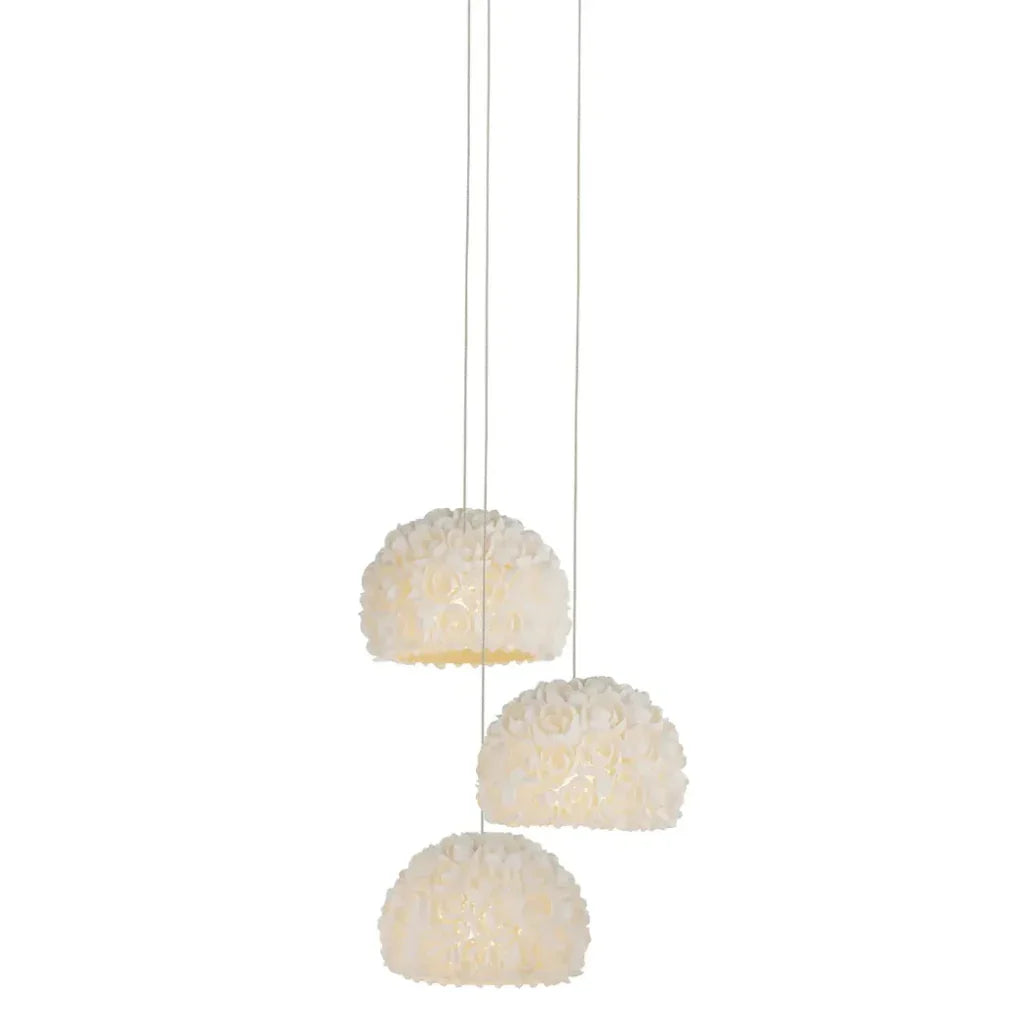 The Virtu 3-Light Round Multi-Drop Pendant has beautifully composed shades around which clamrose shells are fashioned to look like rosebuds; each petal is hand-placed to make this an artisanal offering. The way the illumination wafts through the shade and surrounds the shells is a design detail of note with this lovely nature-inspired luminary.