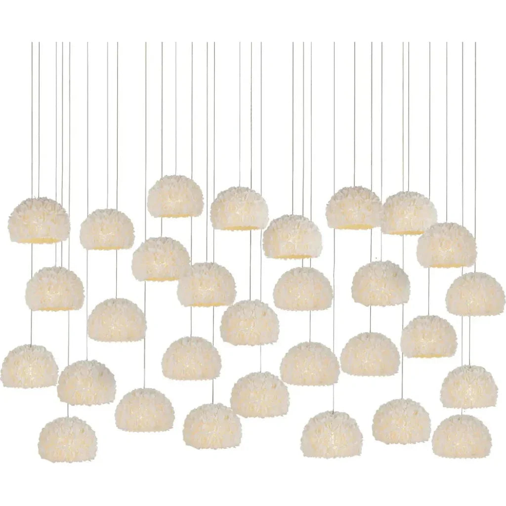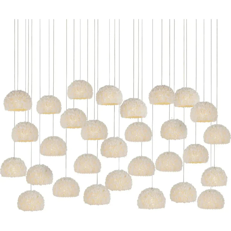 Transform your space with the daring and unique Virtu 30-Light Rectangular Multi-Drop Pendant. Crafted with hand-placed clamrose shell rosebuds and intricate shades, this luminary creates an awe-inspiring display of light. Embrace the adventurous and artisanal aesthetic of nature with this mesmerizing pendant. The beautiful composition of shades and shells captures the essence of rosebuds, making this a true work of art.